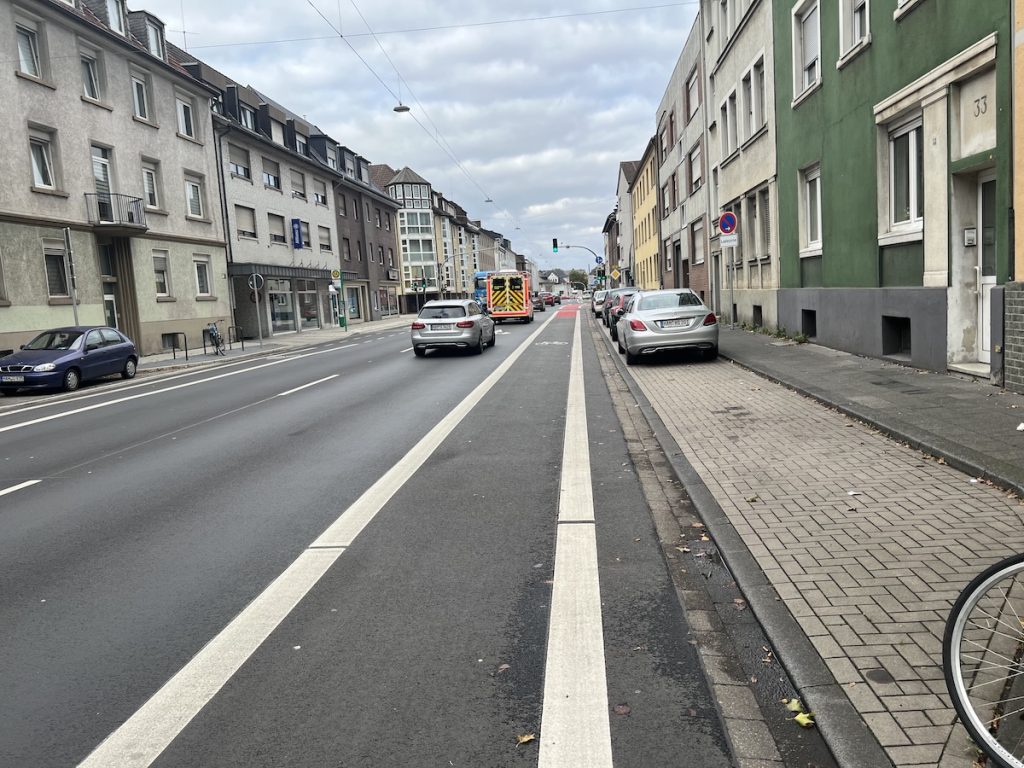 Da ein Radfahrstreifen als Sonderspur nicht Teil der Fahrbahn ist, wird hier eigentlich nicht überholt, sondern die Autos fahren am Radverkehr vorbei. Muss hier überhaupt ein Abstand von 1,5 Metern beim Überholen eingehalten werden? Nach Meinung der Autofahrenden ist das nicht der Fall. Auf der Goethestraße wird dieser Abstand fortlaufend unterschritten. Wenn man Glück hat, fährt das Auto auf der linken Seite seiner Fahrspur, um ein wenig Platz zu schaffen.