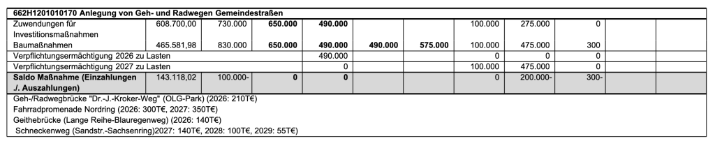 - Fahrradpromenade Nordring (2026: 300T€, 2027: 350T€)