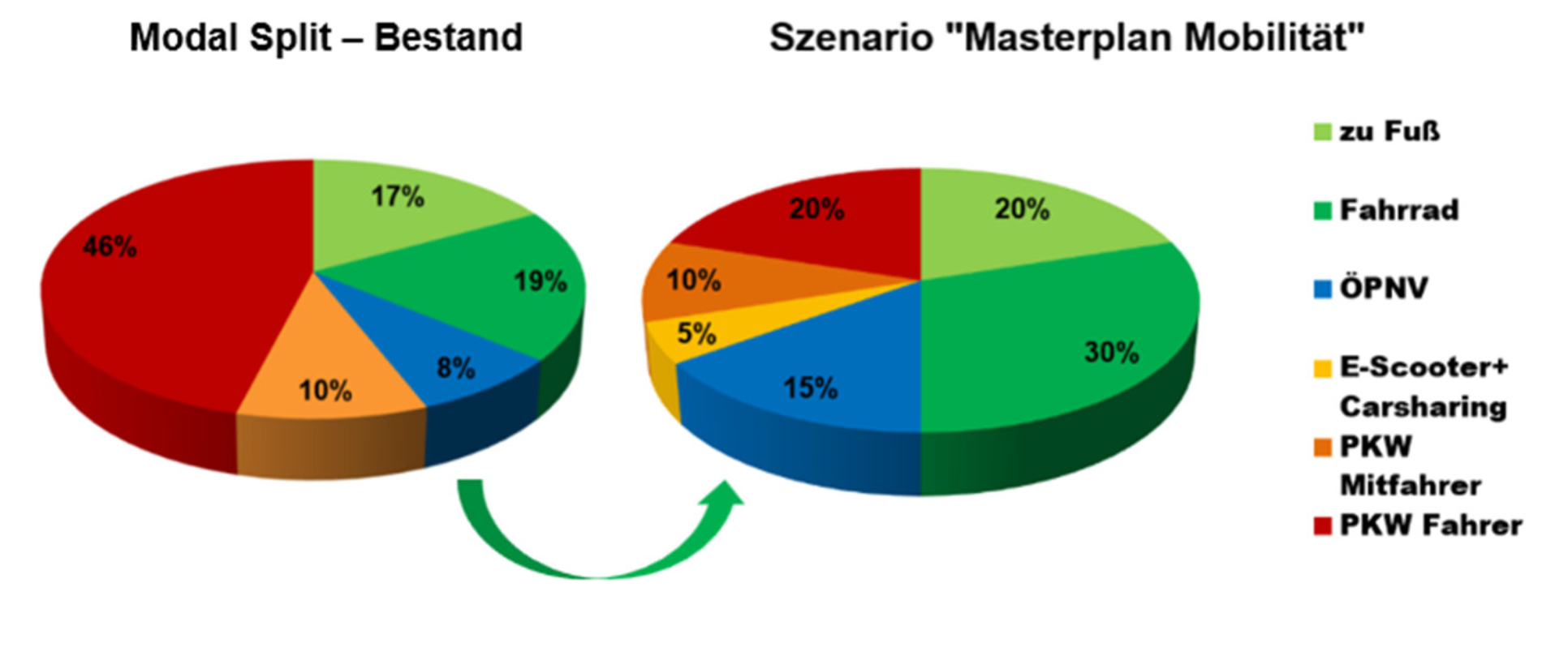 Um die angestrebte Klimaneutralität bis 2035 zu erreichen, müssen im Verkehrssektor 40 % (rd. 20.000 t CO2 / Jahr) eingespart werden. Die Verkehrswende soll in Hamm durch eine Veränderungsstrategie statt durch restriktive Maßnahmen gelingen. Es wird ein schrittweiser Umstieg auf umweltfreundliche Mobilitätsformen angestrebt. Der Pkw würde damit seltener genutzt, steht aber als Mobilitätsoption weiterhin zur Verfügung. Entscheidend für die Klimafreundlichkeit des verbleibenden KFZ-Verkehrs ist zusätzlich die Umstellung auf alternative Antriebe.
